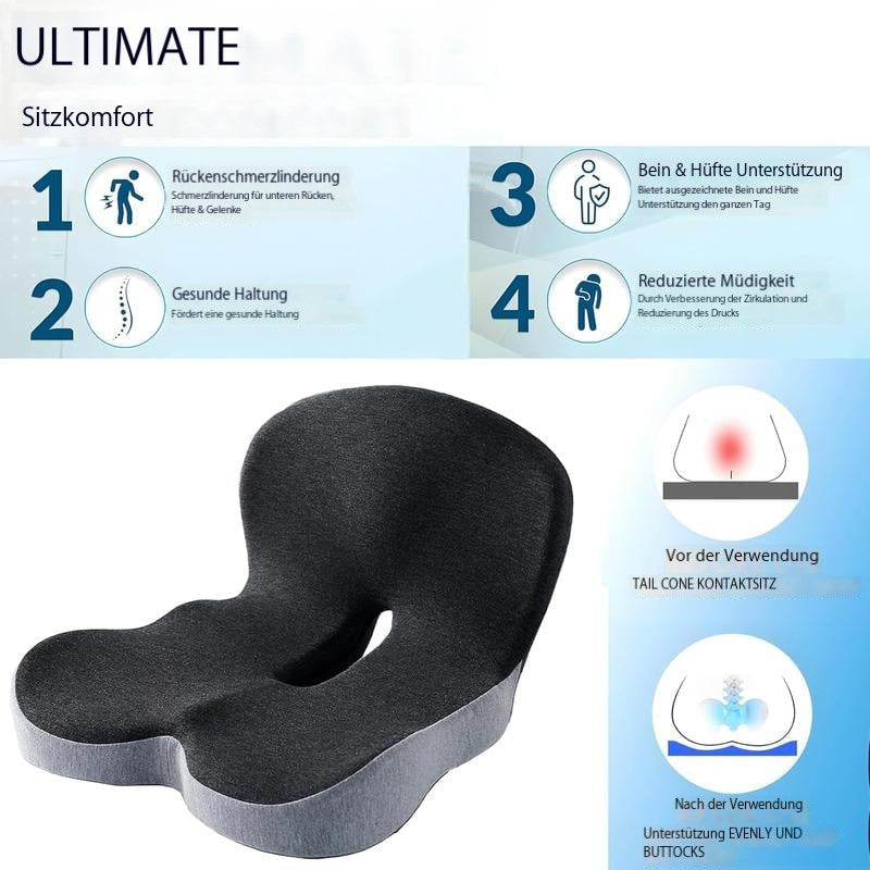 Dieses Sitzkissen aus Memory-Schaum lindert Schmerzen, passt auf die meisten Sitze, verfügt über einen atmungsaktiven Bezug und ein rutschfestes Design für optimalen Komfort den ganzen Tag.