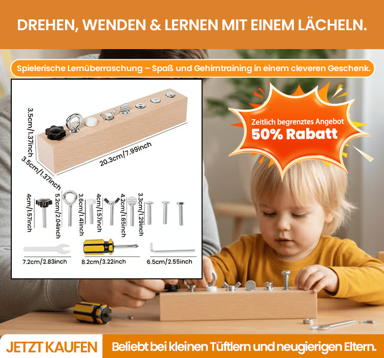 Für neugierige kleine Entdecker: Das pädagogische Schraub-Board verwandelt natürlichen Entdeckerdrang in konzentriertes Spiel und wertvolle Fähigkeiten fürs Leben.Haben Sie ein Kind, das lieber die Fernbedienung zerlegt als fernzusehen? Das den Werkzeugkasten durchstöbert? Das ist kein destruktives Verhalten – es ist der natürliche Drang, zu verstehen, wie Dinge funktionieren. Unser Montessori-inspiriertes Activity-Board lenkt diese Energie in konstruktives, fesselndes und bildschirmfreies Lernen.